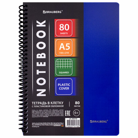 Тетрадь обложка пластик, А5, 80 л., спираль пластик, клетка, BRAUBERG "Metropolis", синий