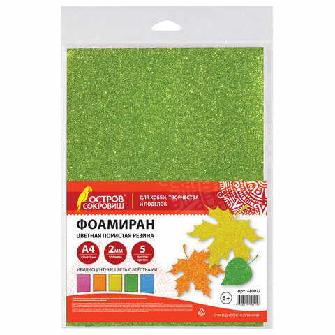 Пористая резина/фоамиран А4, 2 мм, НАБОР, 5 листов, 5 цветов, пастельные цвета, блестки, ОСТРОВ СОКРОВИЩ