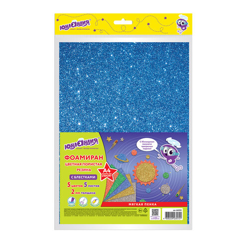 Пористая резина/фоамиран А4, 2 мм, НАБОР, 5 листов, 5 цветов, яркие цвета, блестки, ЮНЛАНДИЯ