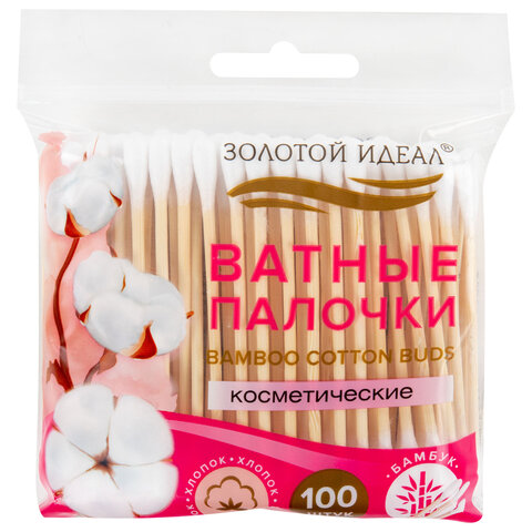 Ватные палочки КОМПЛЕКТ 100 шт., бамбуковый стик, 100% хлопок, зип-лок, ЗОЛОТОЙ ИДЕАЛ