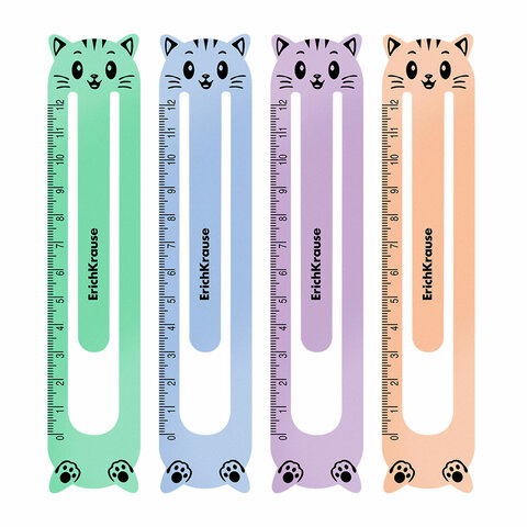 Закладки для книг пластиковые ERICH KRAUSE "Кошки", набор 4 шт., шкала 12 см, ассорти, 0,6 мм