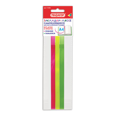 Закладки-ляссе "НЕОН" для книг А4 (длина 38 см) ПИФАГОР, клейкий край, 3 ленты