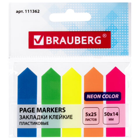 Закладки клейкие неоновые BRAUBERG "СТРЕЛКИ", 50х14 мм, 125 штук (5 цветов х 25 листов)