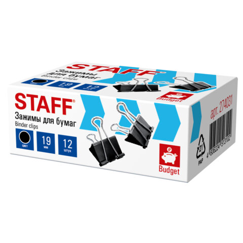 Зажимы для бумаг STAFF ECO, КОМПЛЕКТ 12 шт, 19 мм, на 60 листов, черные, картонная коробка
