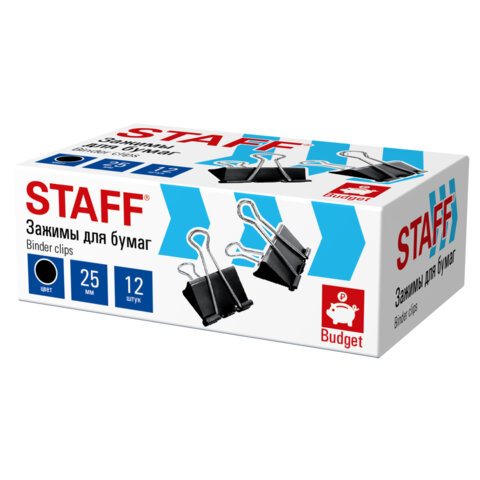 Зажимы для бумаг STAFF ECO, КОМПЛЕКТ 12 шт, 25 мм, на 100 листов, черные, картонная коробка